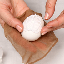 2 Плотно затяните яйцо с кружевом в лоскут из капроновых колготок. Завяжите со стороны тупого конца нитками.