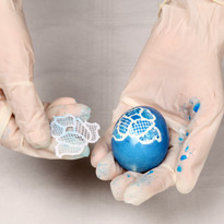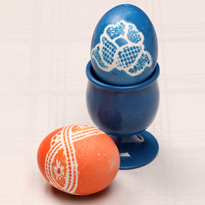 Из салфетки вырежьте понравившийся кружевной мотив. Смочите кусочек кружева в воде и разместите на сваренном яйце.